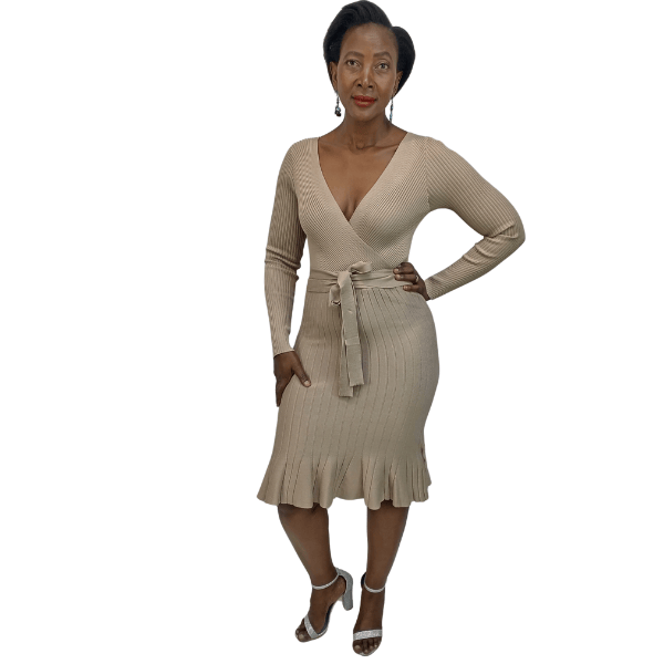 Ribbed knit cross over dress (8809/Stone)