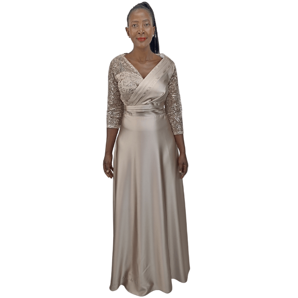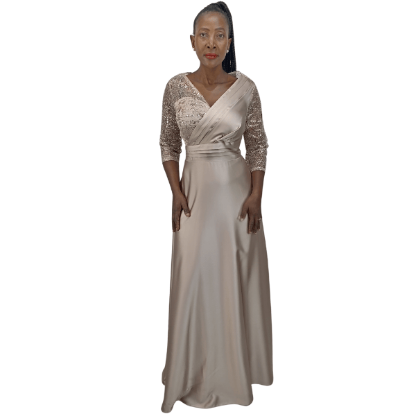 Long satin evening dress with pleated waist (110011/Champagne)